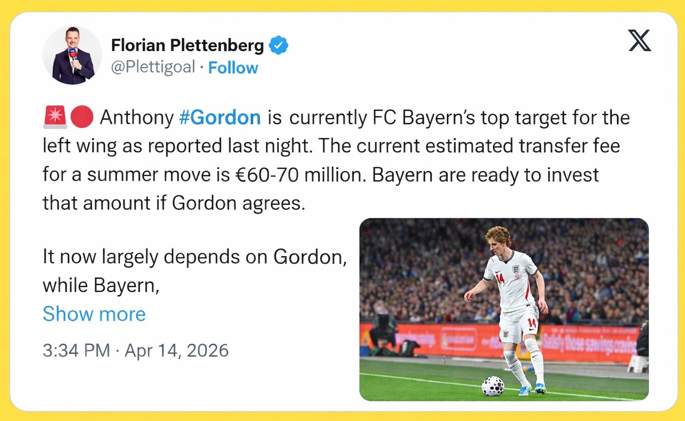 “Anthony Gordon hadda waa bartilmaameedka koowaad ee Bayern ee garabka bidix.
